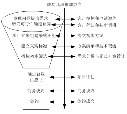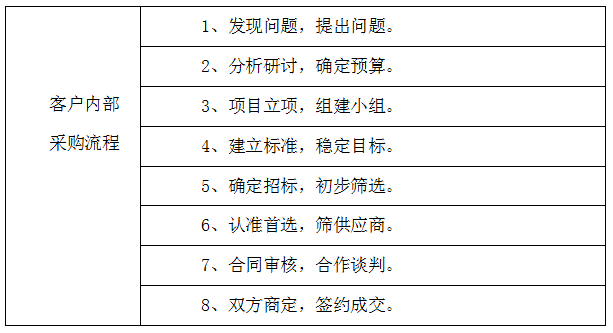 | 企業(yè)業(yè)務管控需要一套完善的管理系統(tǒng),我們這里特別設定企業(yè)業(yè)務管控系統(tǒng)。它不僅僅是一種管理理念,同時也是一個管理體系、一個操作性很強的管理系統(tǒng)。 業(yè)務管控系統(tǒng)非常提倡過程管理,而且控制過程比控制結果更重要。在銷售中,一個銷售項目受到太多來自內部和外部因素的影響,其結果的成敗與否是難以預測和控制的。 一、業(yè)務管控系統(tǒng)的特點 主要是讓原來只掌握在銷售人員手中的有關銷售過程的信息向銷售團隊、銷售經理和企業(yè)公開,使得: l 銷售人員的信息更加公開化,便于掌控客戶的進展; l 讓項目的銷售過程更加明確化,標準化,系統(tǒng)化; l 便于項目內部的角色分工,使團隊合作進一步加強; l 更好地做好銷售管理與銷售預測的工作; l 企業(yè)積累應有的銷售知識和客戶資源。 二、企業(yè)業(yè)務管控系統(tǒng)的模型圖 如圖6-1所示。 ![]() 圖6-1 企業(yè)業(yè)務管控系統(tǒng)的模型圖 基礎組成要素:了解客戶內部采購流程 客戶內部采購流程是從客戶的角度對整個采購過程一般必須經過的步驟進行劃分和描述。它通過跟蹤和記錄客戶采購目前的狀態(tài)以及客戶、競爭對手的回應,依據對內部采購流程的劃分,分析并確定目前客戶采購所處的階段。讓我們更清晰的去了解,如何去對這八大流程階段進行分析,該從哪幾個方面進行著手??蛻魞炔坎少徚鞒贪藗€階段如表6-1所示。 表6-1 八個階段表 ![]() 1、 發(fā)現(xiàn)問題,提出問題; 一般公司都是有現(xiàn)成的供應商,我們的機會點就在尋找目前客戶與現(xiàn)有供應商合作中的不滿意或者問題,往往問題越大,我們的機會點就比較有優(yōu)勢。所以,在采購方的需求醞釀的階段,銷售方在這個階段介入明顯是最好的時機,畢竟“先入為主”,銷售方可以在這個階段影響到采購方的后來的“采購標準”。 2、分析研討,確定預算; 了解目前項目的預算,確立項目立項的可能性,萬一項目的預算少了,一般都要通過老板來進一步申請,這時,往往與老板見面的可能性較大,有時項目的經辦人無法說服他自己的老板,有可能請你協(xié)同說服。 3、項目立項,建立小組; 緊接著,在客戶項目立項階段,銷售顧問應當提供準確信息,培養(yǎng)內部的spy立項,準備應標。因此需要對內部采購流程相當了解,如此才能建立項目采購的優(yōu)勢。 4、建立標準,穩(wěn)定目標; 當客戶的采購部門開始收集信息和標書時,銷售顧問應當在內部確認招標范圍,主動了解技術表述的內容,參與制定采購標準,目的是為了建立客戶關系,同時了解競爭對手以及客戶內部的關系。 5、確定招標,初步篩選; 經辦人通常是客戶內部的采購經理類的角色,他需要發(fā)布信息,收集信息,同時,初步篩選合格的供應商,一般是從十家供應商剩下三家等,為確定首選供應商做鋪墊。 6、認準首選,篩供應商; 通過技術標與商務標的因素而確立篩選的標準,例如:價格、質量、品質、品牌、行業(yè)標準、職業(yè)化、關系等因素來選擇首選的供應商。 7、合同審核,合作談判; 最為采購方來說,確定供應商后,要在談判中盡量壓低成本,并為企業(yè)爭取有利的付款方式降低風險。該項目后續(xù)實施如何很大程度上取決于合同條款上的具體規(guī)定,所以該過程是非常關鍵的,客戶可能專門組織談判小組,與首選供應商來談具體的條款。 8、雙方商定,簽約成交。 商務具體條款雙方商定后,雙方法人簽署合同。開始進入具體的合作及售后服務階段,在該階段之前,可以說銷售方是很成功的,否則,對方也不會選擇和你合作。有人錯認為銷售活動到此結束了,其實還沒有,這只是個開始,如何將該客戶綁定為企業(yè)的忠實客戶,這就需要銷售方在實施及售后客戶關系維系方面下工夫了。 該管控系統(tǒng)的起點是客戶內部采購流程。產品、服務的供應方了解客戶內部采購流程的目的是為了提高銷售的成功率。每個客戶都有自己的一套內部采購流程。供應方想要實現(xiàn)銷售,必須按照客戶的規(guī)則行事,根據客戶的內部采購流程來一步一步推進銷售過程,如果無法隨著客戶內部采購流程不斷前進,就代表著供應方的銷售失敗了。因此,在銷售中,供應方在規(guī)范化企業(yè)內部的銷售流程之前,應該首先關注客戶內部的采購流程??蛻魞炔坎少徚鞒倘绻磺逦筒恢缿撊绾胃鶕蛻舻牟少徚鞒套龀黾皶r準確的響應。 客戶內部采購流程是該管理系統(tǒng)的基礎組成要素。銷售最大的特點就是“以客戶為中心”,在實際銷售中的做法就是:尊重客戶的興趣、需求和規(guī)則。因此,業(yè)務管控系統(tǒng)將“尊重客戶的規(guī)則”放在了第一位,銷售和管理都是圍繞著客戶內部采購流程展開的。銷售流程管理系統(tǒng)從兩個方面向我們介紹客戶內部采購流程。首先是從理論推廣的角度,向我們介紹了客戶的內部采購流程的一般形式和步驟。其次是從實際應用的角度,向我們介紹客戶內部采購流程的操作和應用,譬如如何根據客戶內部采購流程來收集和使用有關客戶、競爭對手的信息。 主要組成要素:業(yè)務推進流程 我們知道,處于內部采購流程不同階段的客戶位于銷售漏斗的不同狀態(tài)。隨著內部采購流程的推進,客戶所在的狀態(tài)也在向銷售漏斗底部的最佳狀態(tài)推進,這也意味著銷售的成功