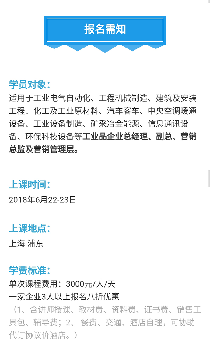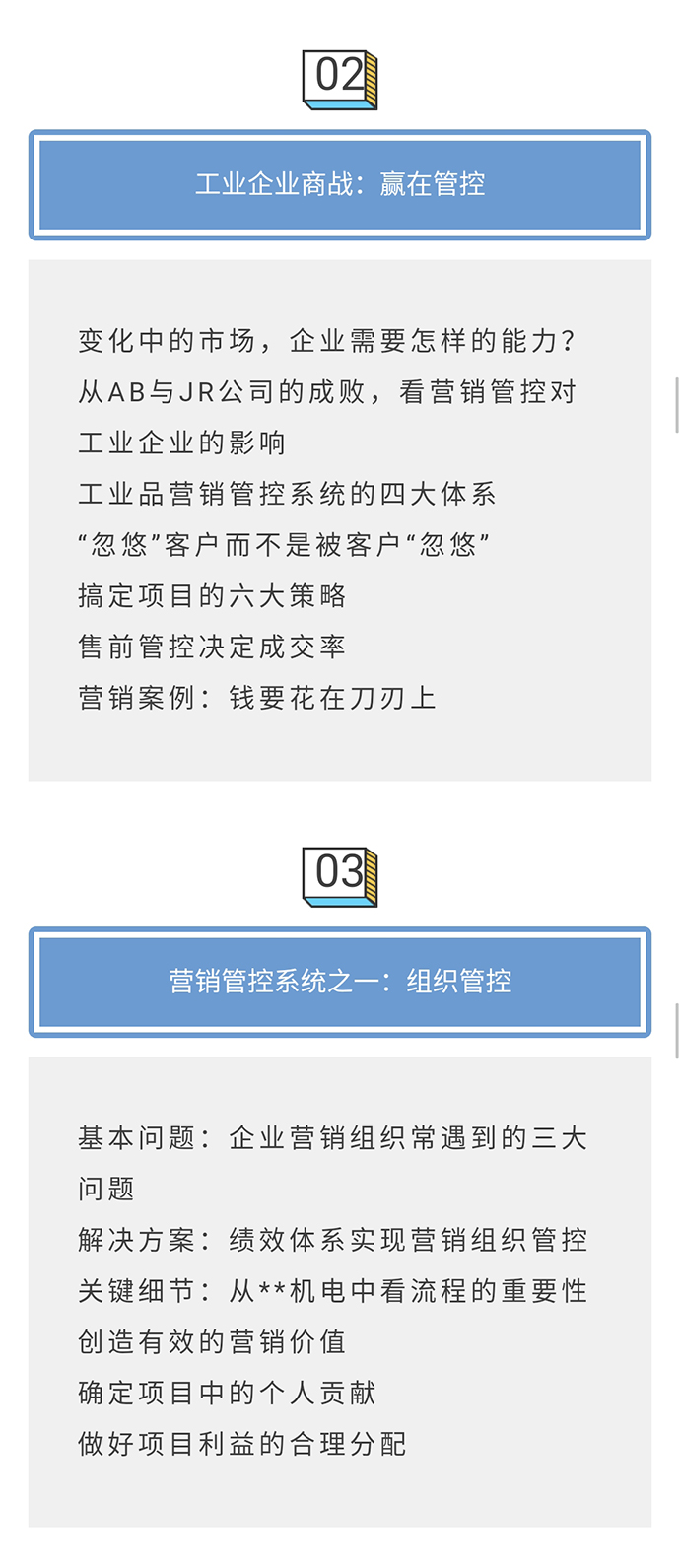 【營銷管控公開課預(yù)告】2018年6月22-23日 深度營銷管控系列“工業(yè)品營銷管控”公開課! 點(diǎn)擊次數(shù):5764發(fā)布時(shí)間:2018-6-1 17:06:54 上一條:【新產(chǎn)品品牌及推廣開課預(yù)告】 6月8-10日 工業(yè)新產(chǎn)品市場規(guī)劃與推廣傳播策略公開課下一條:【總裁班開課預(yù)告】8月24-26日 中國工業(yè)品營銷實(shí)戰(zhàn)咨詢式輔導(dǎo)總裁班!