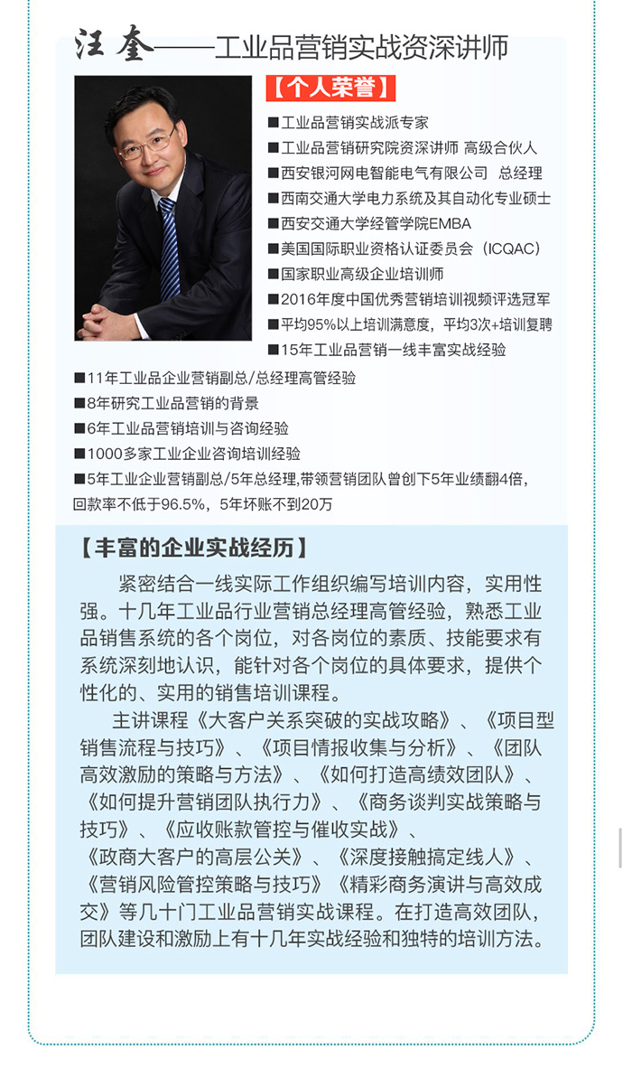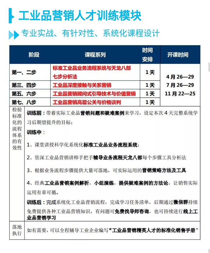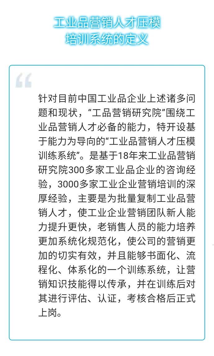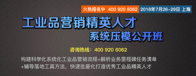 【人才壓模開(kāi)課預(yù)告】7月26-29日 工業(yè)品營(yíng)銷(xiāo)精英人才壓模系統(tǒng)公開(kāi)課 點(diǎn)擊次數(shù):5877發(fā)布時(shí)間:2018-6-22 15:54:14 上一條:【總裁班開(kāi)課預(yù)告】8月24-26日 中國(guó)工業(yè)品營(yíng)銷(xiāo)實(shí)戰(zhàn)咨詢(xún)式輔導(dǎo)總裁班!下一條:【總裁班開(kāi)課預(yù)告】12月21-23日 中國(guó)工業(yè)品營(yíng)銷(xiāo)實(shí)戰(zhàn)咨詢(xún)式輔導(dǎo)總裁班!