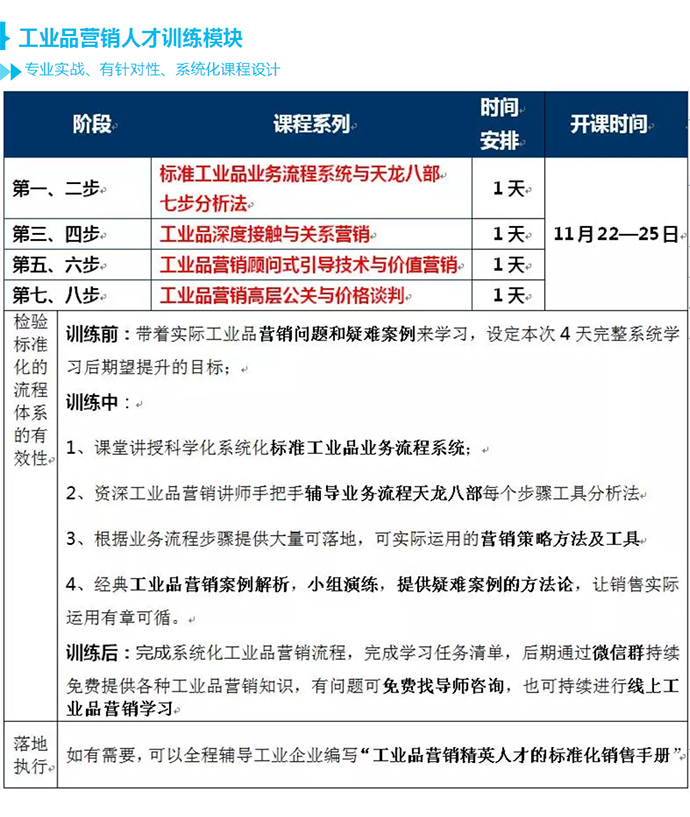 【人才壓模開課預(yù)告】11月22-25日 工業(yè)品營銷精英人才壓模系統(tǒng)公開課 點(diǎn)擊次數(shù):5904發(fā)布時(shí)間:2018-6-28 11:22:27 上一條:【總裁班開課預(yù)告】12月21-23日 中國工業(yè)品營銷實(shí)戰(zhàn)咨詢式輔導(dǎo)總裁班!下一條:【營銷管控公開課預(yù)告】10月26-27日 深度營銷管控系列“工業(yè)品營銷管控”公開課!