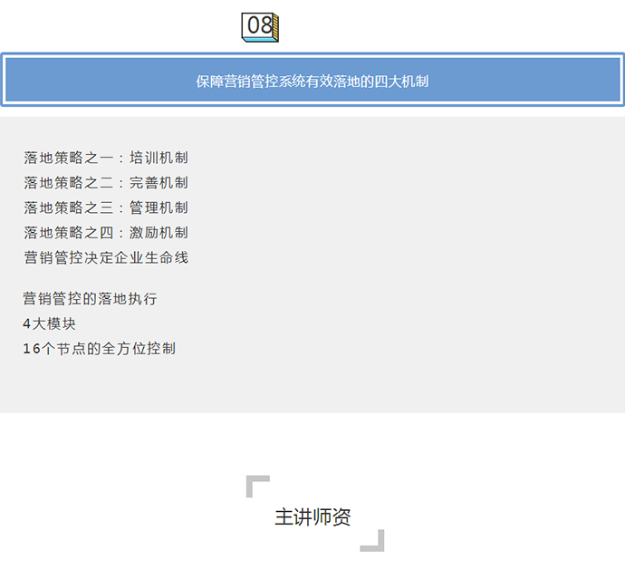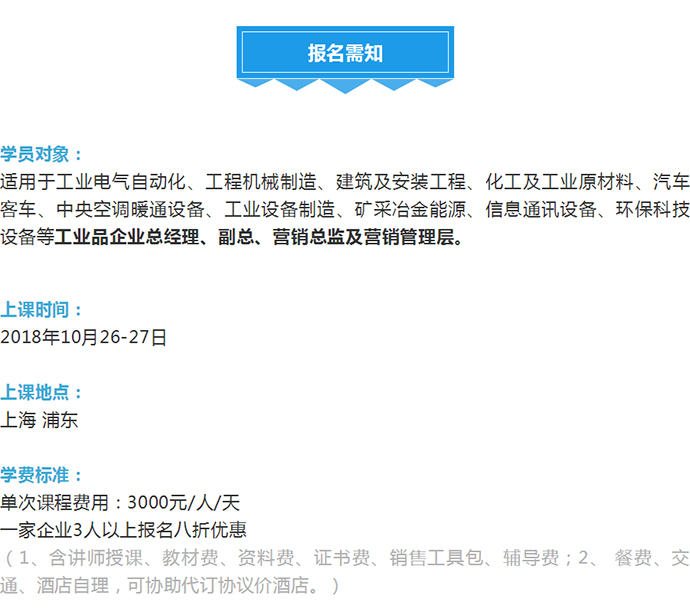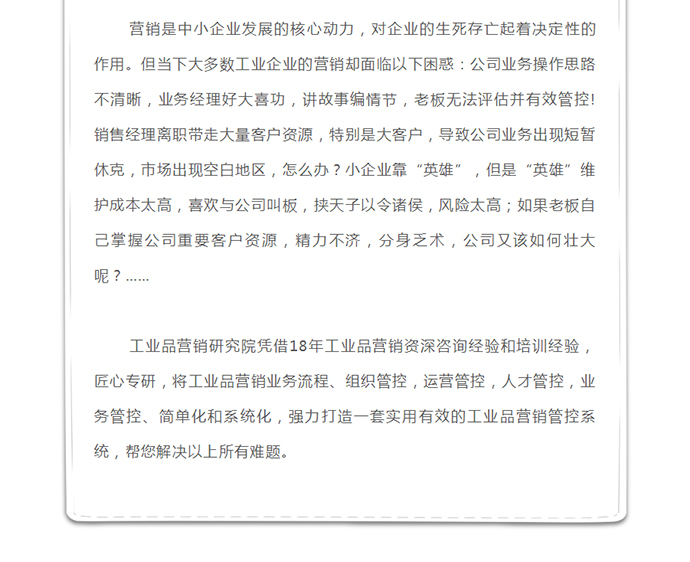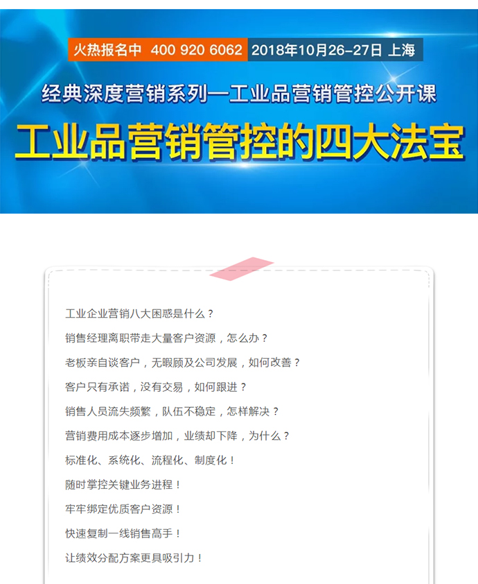 【營銷管控公開課預(yù)告】10月26-27日 深度營銷管控系列“工業(yè)品營銷管控”公開課! 點(diǎn)擊次數(shù):5957發(fā)布時(shí)間:2018-6-28 11:24:19 上一條:【人才壓模開課預(yù)告】11月22-25日 工業(yè)品營銷精英人才壓模系統(tǒng)公開課下一條:【新產(chǎn)品品牌及推廣開課預(yù)告】 10月12-14日 工業(yè)新產(chǎn)品市場規(guī)劃與推廣傳播策略公開課