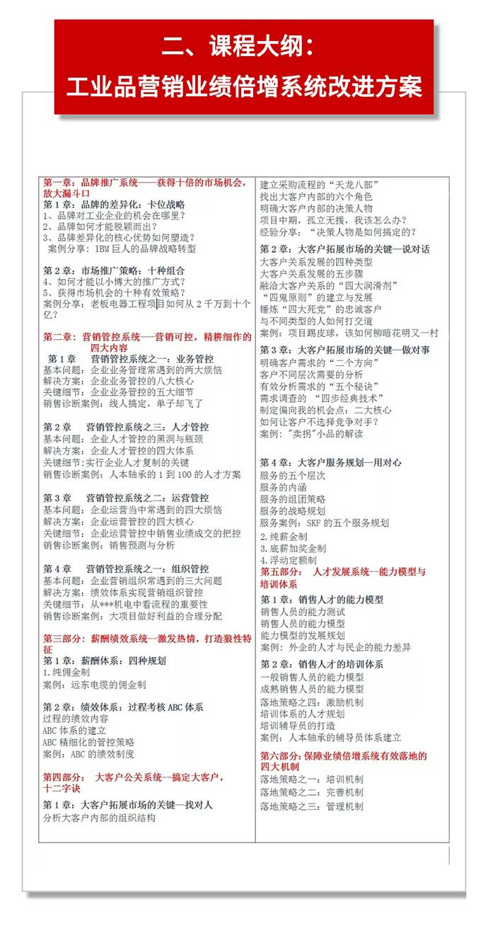 【公開課預(yù)告】2019年8月30-31日工業(yè)品營銷業(yè)績倍增的系統(tǒng)改進(jìn)方案公開課 點擊次數(shù):6582發(fā)布時間:2019-4-28 21:04:18 上一條:【公開課預(yù)告】2019年6月29—30日打造高績效的工業(yè)品營銷團(tuán)隊公開課下一條:【公開課預(yù)告】2019年10月26-27日應(yīng)收賬款催收30計、信用管理與全款追賬策略公開課