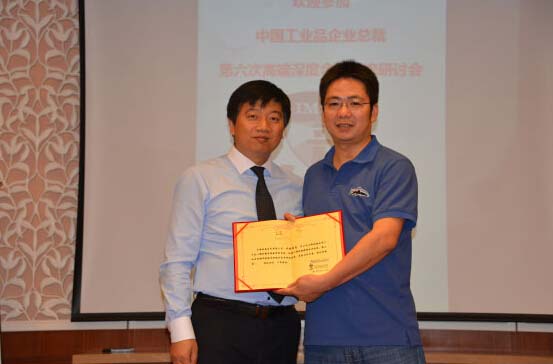 丁興良院長(zhǎng)給天津迪安電氣有限公司董事長(zhǎng)葉標(biāo)頒發(fā)最佳天龍八部營(yíng)銷實(shí)踐獎(jiǎng)