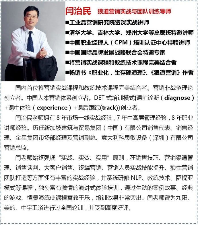 20%的客戶創(chuàng)造80%的利潤,如何把控及經(jīng)營好這20%的大客戶,利用3500個(gè)工業(yè)品大額產(chǎn)品的銷售案例研究出的銷售智慧,培訓(xùn)過全國60%大中型知名工業(yè)企業(yè),獲得一致好評(píng)的經(jīng)典課程體系!