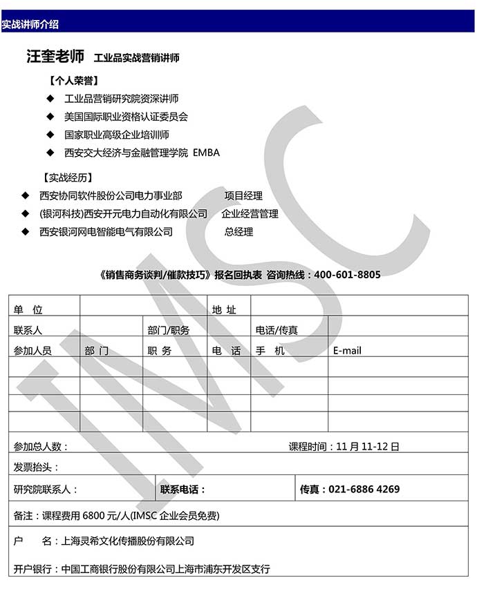 | 下一條:【往期公開課】工業(yè)企業(yè)營銷生態(tài)圈-大客戶實(shí)戰(zhàn)銷售秘笈與招投標(biāo)11月25-26日 |