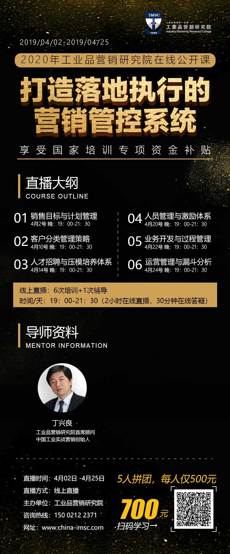 4月2日—4月25日,在線直播:打造落地執(zhí)行的工業(yè)品營銷管控系統(tǒng)公開課(17個小時,適合中高層,線下公開課原價8000元/人),6次直播課程,2:30小時/次+1次2小時深度輔導!