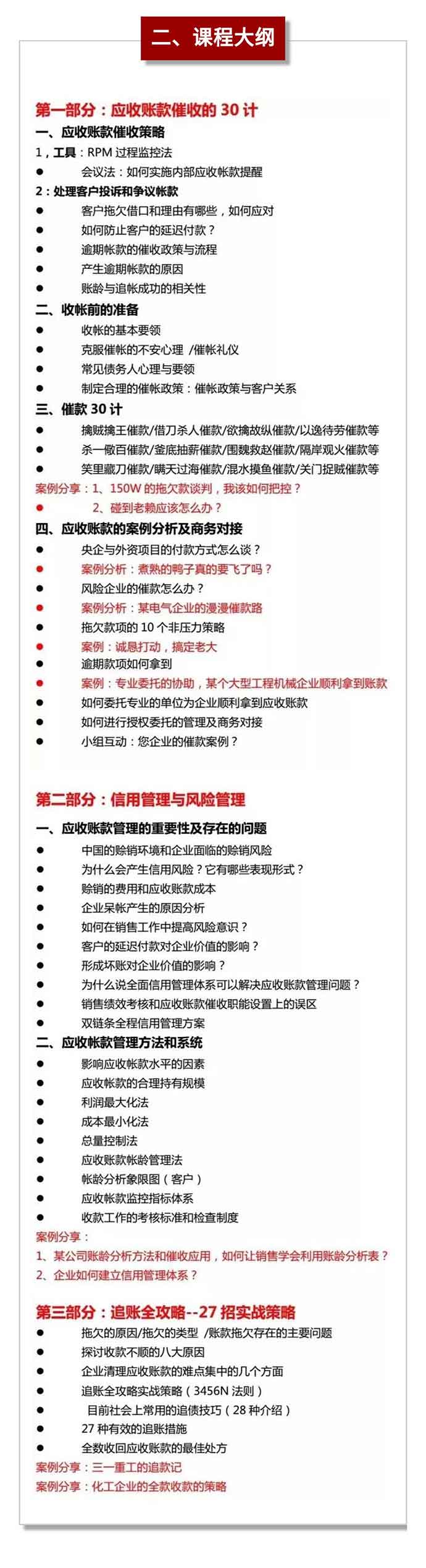 1-從銷售催收實戰(zhàn)技巧的角度來總結(jié)催款30計的策略;從企業(yè)信用管理與風(fēng)險防范的角度來分析風(fēng)險管控;催收專家從落地執(zhí)行的角度來分析如何才能確??铐椨行Щ厥?,甚至可以把催收實戰(zhàn)的感悟與經(jīng)驗進(jìn)行系統(tǒng)整合并和盤托出,2天時間學(xué)到催收高手10年的寶貴經(jīng)驗,形成催收、信用、追賬一站式落地執(zhí)行的方案。