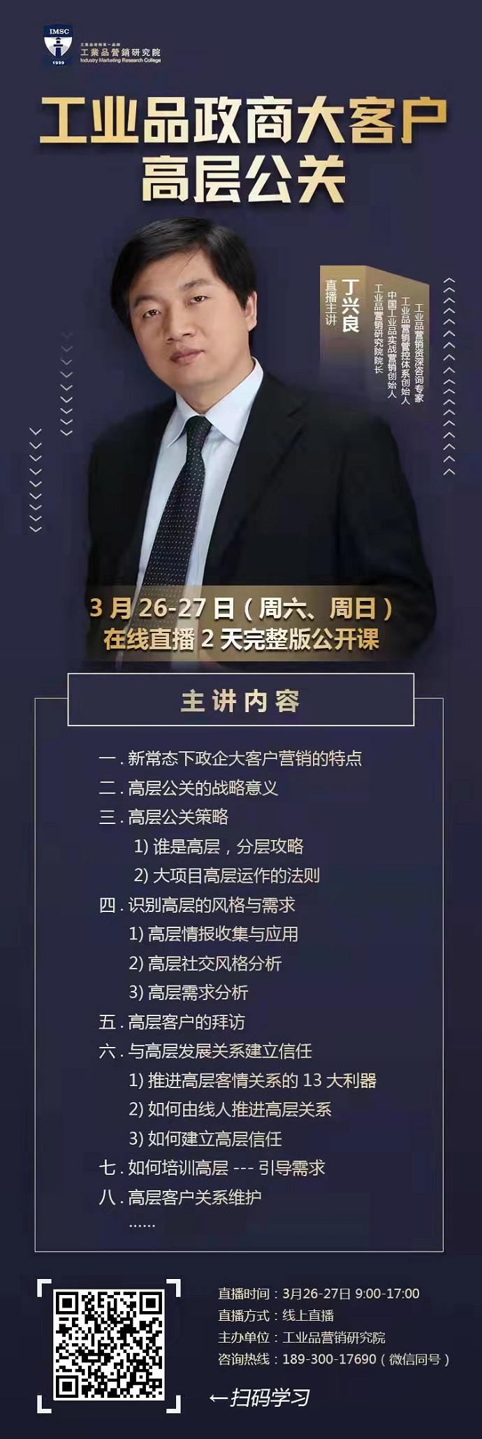 工業(yè)品營銷研究院2003年專注于工業(yè)品營銷研究領(lǐng)域,創(chuàng)始人丁興良院長攜手數(shù)位工業(yè)品營銷專家發(fā)起,是中國第一家專注于工業(yè)品營銷咨詢與培訓的專業(yè)智力機構(gòu),在國內(nèi)第一家提出工業(yè)品營銷概念的咨詢機構(gòu),擁有最懂工業(yè)品營銷咨詢和培訓的頂尖實戰(zhàn)派專家實力團隊,熟知工業(yè)品企業(yè)特質(zhì),深諳工業(yè)品營銷模式。工業(yè)品營銷咨詢、工業(yè)品營銷培訓、工業(yè)品營銷線上學習平臺、研發(fā)工業(yè)品業(yè)務流程管控PSM軟件、編寫工業(yè)品營銷手冊,出版工業(yè)品營銷專業(yè)書籍80本等,360度全方位輔導廣大工業(yè)品企業(yè),成為中國工業(yè)品營銷咨詢與培訓的領(lǐng)航者!