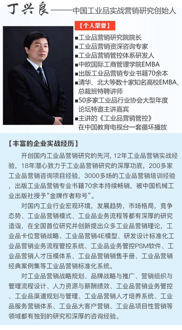 | 項目背景 聚焦當(dāng)今工業(yè)品企業(yè)老板面臨的困惑! 當(dāng)下市場經(jīng)濟(jì)環(huán)境惡劣,實體經(jīng)濟(jì)遇到前所未有的挑戰(zhàn),銀行貸款只收不放、環(huán)保壓力與日俱增、產(chǎn)業(yè)重復(fù)投資的惡果不斷浮現(xiàn)、同行生存的前景堪憂、市場價格戰(zhàn)不斷發(fā)生、利潤越來越微薄.... 經(jīng)濟(jì)環(huán)境受2012年經(jīng)濟(jì)危機(jī)影響以來,中國鋼鐵行業(yè)虧損面超三成,大批鋼廠實質(zhì)性停產(chǎn)減壓;工程機(jī)械某企業(yè)上半年凈利下滑50%~80%;十大光伏產(chǎn)業(yè)巨頭已近破產(chǎn)邊緣,如某光伏企業(yè)上半年凈虧10億元,資產(chǎn)負(fù)債率高達(dá)80%;國內(nèi)風(fēng)電設(shè)備產(chǎn)能過剩率50%以上;浙江某硅業(yè)破產(chǎn),掀多晶硅行業(yè)倒閉潮;浙江某船業(yè)負(fù)債3億申請破產(chǎn);企業(yè)貸不了款,銀行 “晴天借傘,雨天收傘”…… 營銷管理者對于企業(yè)的價值,已不僅僅是驅(qū)動市場營銷活動,還將影響產(chǎn)品開發(fā)策略、供應(yīng)鏈策略、商品定價策略、客戶服務(wù)策略、人才團(tuán)隊培養(yǎng)……只有那些能在不斷變化的環(huán)境中仍能所向披靡的營銷管理者,才能幫助企業(yè)成功打造營銷領(lǐng)域的核心競爭力,成為一個卓越的營銷企業(yè)。 身處如此宏觀經(jīng)濟(jì)環(huán)境中,您的企業(yè)是否也正在面臨如下困境? 營銷管理者對于企業(yè)的價值,已不僅僅是驅(qū)動市場營銷活動,還將影響產(chǎn)品開發(fā)策略、供應(yīng)鏈策略、商品定價策略、客戶服務(wù)策略、人才團(tuán)隊培養(yǎng)……只有那些能在不斷變化的環(huán)境中仍能所向披靡的營銷管理者,才能幫助企業(yè)成功打造營銷領(lǐng)域的核心競爭力,成為一個卓越的營銷企業(yè)。 ![]() 成本在上升→ 利潤微薄化 產(chǎn)品同質(zhì)化→ 價格透明化 招標(biāo)現(xiàn)象多→ 成本觸底線 低增長的經(jīng)濟(jì)模式→ 風(fēng)險大于市場機(jī)遇 內(nèi)銷市場持續(xù)乏力→ 出口市場不斷萎縮 空白市場越來越少→ 供求市場嚴(yán)重失衡 市場需求持續(xù)低迷→ 企業(yè)發(fā)展遭遇危機(jī) 全新的經(jīng)營與傳播模式→ 消費(fèi)者日益成熟 工業(yè)品營銷研究院依托18年來對中國工業(yè)產(chǎn)業(yè)的深入研究。300多家工業(yè)品營銷咨詢項目的深厚經(jīng)驗,3000多家工業(yè)企業(yè)的營銷培訓(xùn)經(jīng)驗,緊扣時代發(fā)展的脈搏,順應(yīng)工業(yè)企業(yè)市場發(fā)展的個性化需求,2019年再度升級傾情打造全國最高端、最專業(yè)、最系統(tǒng)的“工業(yè)品營銷實戰(zhàn)咨詢式輔導(dǎo)總裁班”,為工業(yè)品企業(yè)老板量身打造工業(yè)品系統(tǒng)營銷高端課程。 由工業(yè)品營銷研究院院長、中國工業(yè)品實戰(zhàn)營銷創(chuàng)始人,工業(yè)品營銷資深咨詢專家丁興良領(lǐng)銜主講,采用咨詢式培訓(xùn)及經(jīng)典案例教學(xué),經(jīng)典工業(yè)企業(yè)實操咨詢案例解析借鑒、曾經(jīng)您所面臨的所有困惑將迎刃而解,行業(yè)最權(quán)威最資深的工業(yè)品營銷專家將帶領(lǐng)你撥開層層迷霧,讓你突破傳統(tǒng)思維的格局,從局部思維到企業(yè)戰(zhàn)略系統(tǒng),從企業(yè)戰(zhàn)略系統(tǒng)到企業(yè)盈利模式創(chuàng)新,致力于鍛造一批精通營銷戰(zhàn)略和管理,運(yùn)籌帷幄的卓越工業(yè)品行業(yè)領(lǐng)軍人,為中國工業(yè)品企業(yè)高層管理創(chuàng)建開闊的學(xué)習(xí)交流平臺! 營銷是企業(yè)的大動脈,企業(yè)老板如何把控企業(yè)長盛不衰,基業(yè)長青的生命線!“工業(yè)品營銷實戰(zhàn)咨詢式輔導(dǎo)總裁班”,工業(yè)品企業(yè)老板、營銷高管不能不聽的一堂課! 課程特色 ⊙復(fù)合知識結(jié)構(gòu)教學(xué) 科學(xué)系統(tǒng)化理論體系+經(jīng)典工業(yè)企業(yè)營銷咨詢案例解析+落地輔導(dǎo)營銷管理工具 ⊙實戰(zhàn)咨詢案例教學(xué) 依托工業(yè)品營銷研究院300多家企業(yè)咨詢的實操經(jīng)驗,針對學(xué)員企業(yè)的問題及需求針對性選取案例講授,現(xiàn)場問答,課后一對一微咨詢深入交流,探討解決思路。 ⊙導(dǎo)師制1對1深入交流: 資深專家一對一咨詢輔導(dǎo),手把手教你落地,交少量培訓(xùn)費(fèi),收獲巨大的咨詢式培訓(xùn)效果!強(qiáng)實操面對面應(yīng)用指導(dǎo)。 ⊙學(xué)員與工業(yè)企業(yè)標(biāo)桿互學(xué) 鏈接高端人脈,搭建優(yōu)勢互補(bǔ)互學(xué)平臺。在整個課程中,我們將分析一些典型性工業(yè)企業(yè)案例,說明我們講授的不同概念的實際應(yīng)用情況。學(xué)員們將參與各種各樣的創(chuàng)造性診斷規(guī)劃練習(xí),學(xué)習(xí)如何完善企業(yè)的戰(zhàn)略性營銷規(guī)劃流程、品牌塑造及推廣的方式、營銷團(tuán)隊組織設(shè)計及流程優(yōu)化、績效新模式承包制如何運(yùn)用、如何構(gòu)建工業(yè)品標(biāo)準(zhǔn)化營銷管控系統(tǒng)。 ⊙一次性學(xué)習(xí)五大系統(tǒng)化領(lǐng)導(dǎo)課程 3天2晚,一次性解決工業(yè)企業(yè)老板及高管關(guān)注及面臨的困惑:從戰(zhàn)略到品牌、組織設(shè)計、績效驅(qū)動、營銷管控,一對一深入的交流企業(yè)面臨困惑及問題診斷輔導(dǎo)。 課程收益 面對產(chǎn)業(yè)盲目投資