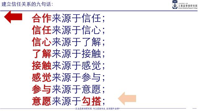 用通俗語言提煉了“同流不合污的五句經(jīng)典---不能同流怎能交流、不能交流怎能交心、不能交心怎能交易、不能交易怎能交錢、不能交錢怎能交貨”、“建立信任感的九句話--合作來源于信任;信任來源于信心;信心來源于了解;了解來源于接觸;接觸來源于感覺;感覺來源于參與;參與來源于意愿;意愿來源于勾搭”、“大客戶內(nèi)部關(guān)系搞定的三句經(jīng)典—消滅反對者、拉攏中立者、擴(kuò)大支持者”等;更為了協(xié)助學(xué)員更好地落地提出了—大客戶攻關(guān)的五個工具、大客戶降價的二個關(guān)鍵工具、分析教練(結(jié)果導(dǎo)向型線人)的判斷工具等。