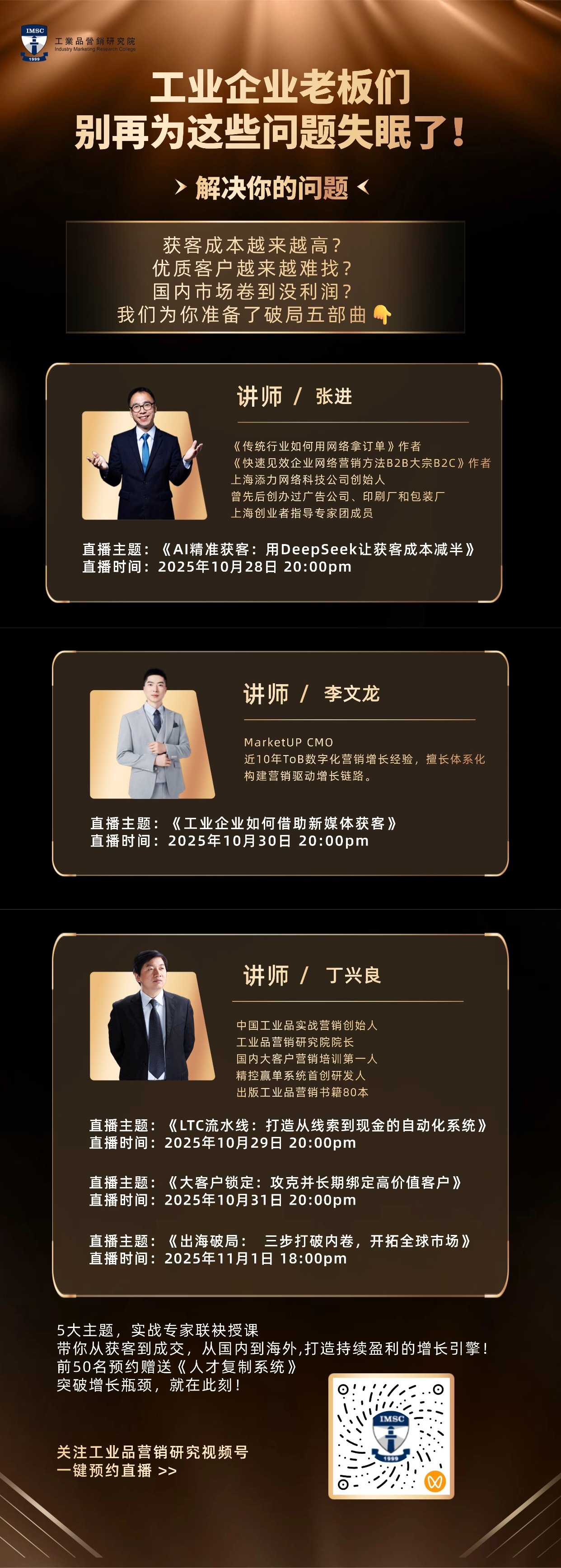 | 下一條:【確認(rèn)開課,歡迎咨詢】11月28-29日-打造工業(yè)品營銷管控七大系統(tǒng)-高管班 |