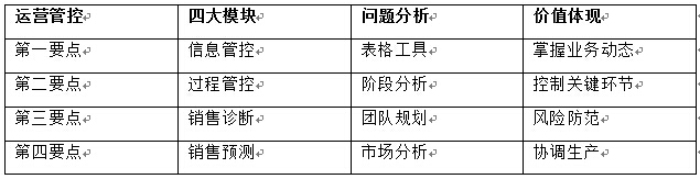 運(yùn)營管控主要是指在營銷過程當(dāng)中對銷售信息的管控、項(xiàng)目的管控及費(fèi)用的管控等,從而實(shí)現(xiàn)一切盡在掌控之中。運(yùn)營管控的實(shí)質(zhì),是資源的管控, 即對企業(yè)擁有的資源進(jìn)行充分的有效調(diào)解。運(yùn)營管控表如圖2所示。