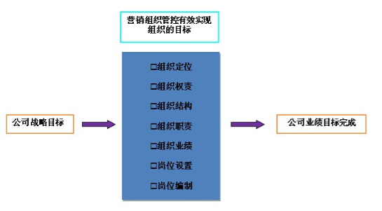 組織管控分為兩部分,一部分是集團(tuán)公司對于分公司的管控,另一部分是指公司整體對于各分職能部門的管控。而在這里,我們重點(diǎn)分析公司整體對于各分職能部門的管控。對于一個企業(yè)來說,最為重要的是營銷組織,如何進(jìn)行營銷組織的有效管控,是企業(yè)發(fā)展的關(guān)鍵一步。特別在一些大公司、大集團(tuán),以及大部分的工業(yè)品企業(yè),營銷組織的管控更為重要。營銷組織管控是指企業(yè)運(yùn)用組織設(shè)計(jì)來實(shí)現(xiàn)公司對營銷組織的管理及控制。營銷組織管控是有效實(shí)現(xiàn)組織目標(biāo)的管理手段,通過實(shí)施管控將組織目標(biāo)落實(shí)到每個崗位,每個員工,最終實(shí)現(xiàn)組織的業(yè)績目標(biāo).組織管控圖如圖1所示。