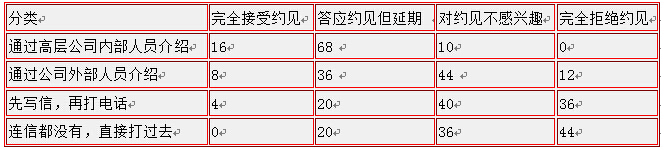 國(guó)外的銷售專家做過(guò)類似的調(diào)查,看大部分的公司高層面對(duì)各種不同的商務(wù)約見(jiàn),都會(huì)做什么回復(fù)。如圖所示: