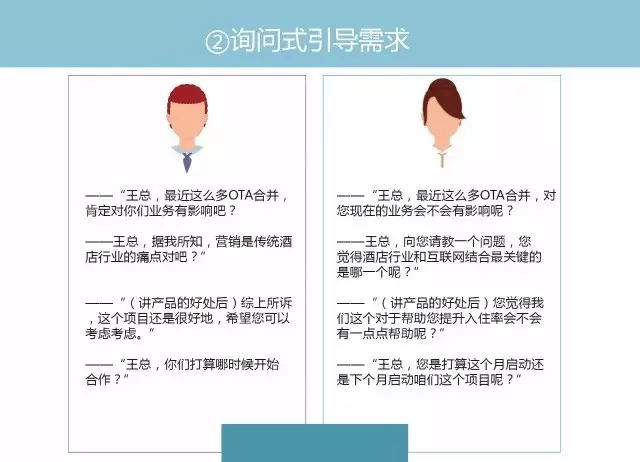 一場成功的面談:70%是客戶說,30%是你說。個(gè)別行業(yè),如互聯(lián)網(wǎng)行業(yè),一個(gè)新產(chǎn)品摸索市場,可能占比各是50%。