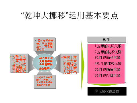 乾坤大挪移的奧妙在于讓對(duì)手攻擊之力牽引到別處,讓對(duì)手有力施不出。對(duì)手的力來(lái)自于技術(shù)壟斷力,品牌影響力或者價(jià)格優(yōu)勢(shì)力等。但如何一點(diǎn)優(yōu)勢(shì)在客戶眼中是否起到實(shí)際的作用,關(guān)鍵在于客戶的評(píng)判標(biāo)準(zhǔn)。并且不同的企業(yè)各有側(cè)重。面對(duì)對(duì)手的攻擊,將起攻擊力轉(zhuǎn)移到其他地方?;蛘呋馄鸸袅?。施展此招時(shí),要發(fā)現(xiàn)對(duì)手主要攻擊力的源頭,在其根源上化解。讓對(duì)手失去優(yōu)勢(shì)。