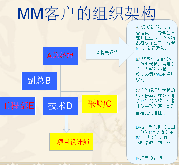到了11月的中旬,還是沒有消息。我再次的給采購部門C打電話,C回應(yīng)是你的樣品已經(jīng)我看過啦,不過現(xiàn)在還在副總哪里審批。11月18,再次拜訪MM公司,我給C帶了了兩盒白茶葉,于是C將我直接帶到B的辦公室,聊了半個小時,正好快到中午的時候C就打電話給到D,約中午一起吃飯,這個時候通過和B。C/D一起吃飯期間。聊到我們的產(chǎn)品技術(shù)壁壘,可以解決F目前項目的技術(shù)難題。這個時候B開始同意我們先進駐,但不是主力供應(yīng)商。