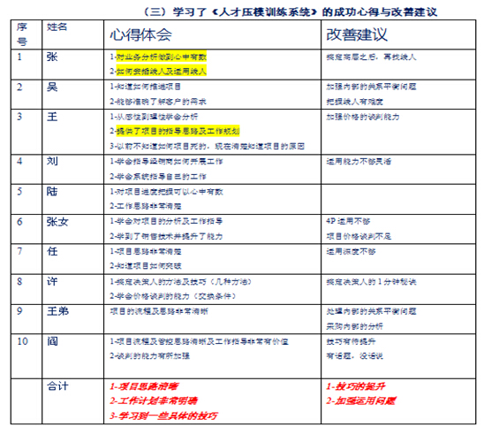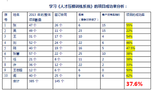 2012年成功率為: 18% ,[2013年相比2012年,項目成功率有了明顯改善110%,效果非常明顯 ] 2、培訓后業(yè)務(wù)員學習心得及改善建議